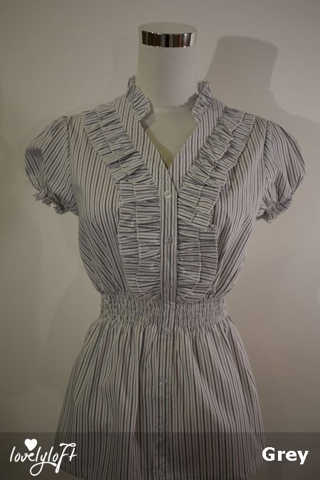 Description: Simple but sweet and cute - we're looking at a short Victorian-style collar, V-neck, striped shirt. 3 real buttons at the top (the rest are sewn on). Puffed sleeves with comfortable stretchable elastic at arm band. Comfortably smocked waist (and yes we just anything which clinches at the waist for that slimmer effect). Ruffles run along the button line from shoulders to waist where the smock starts. Available in 3 colours - grey, blue and orange and 2 sizes for each colour:- M : Fits UK 6 to 8 L : Fits UK 10 to 12